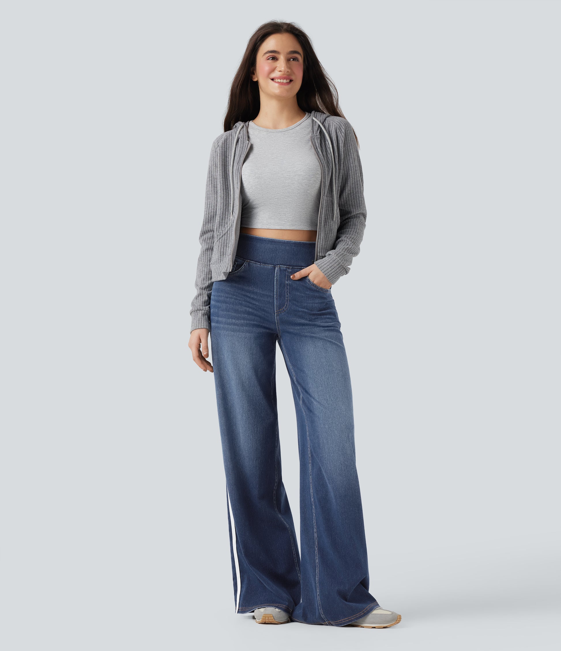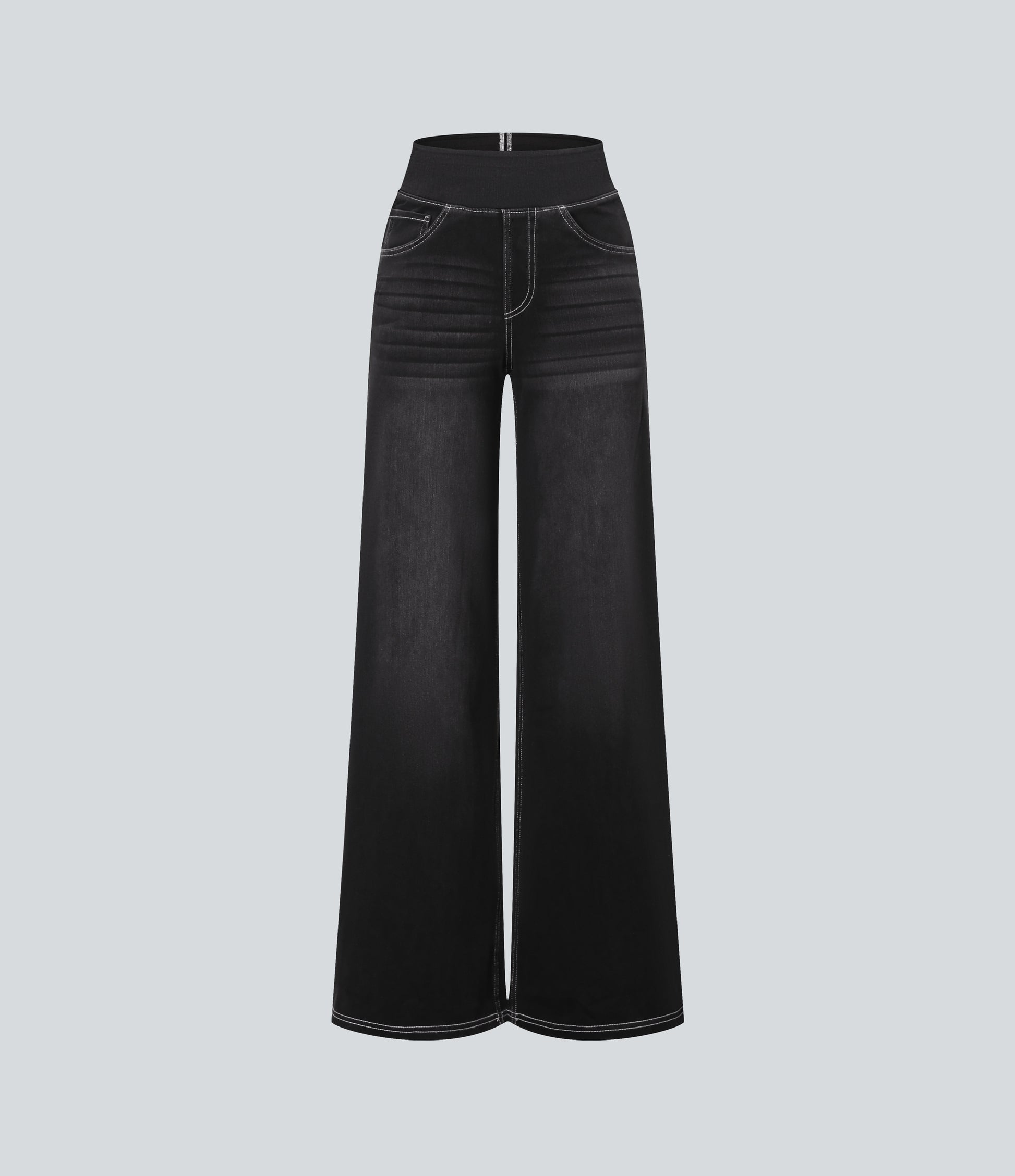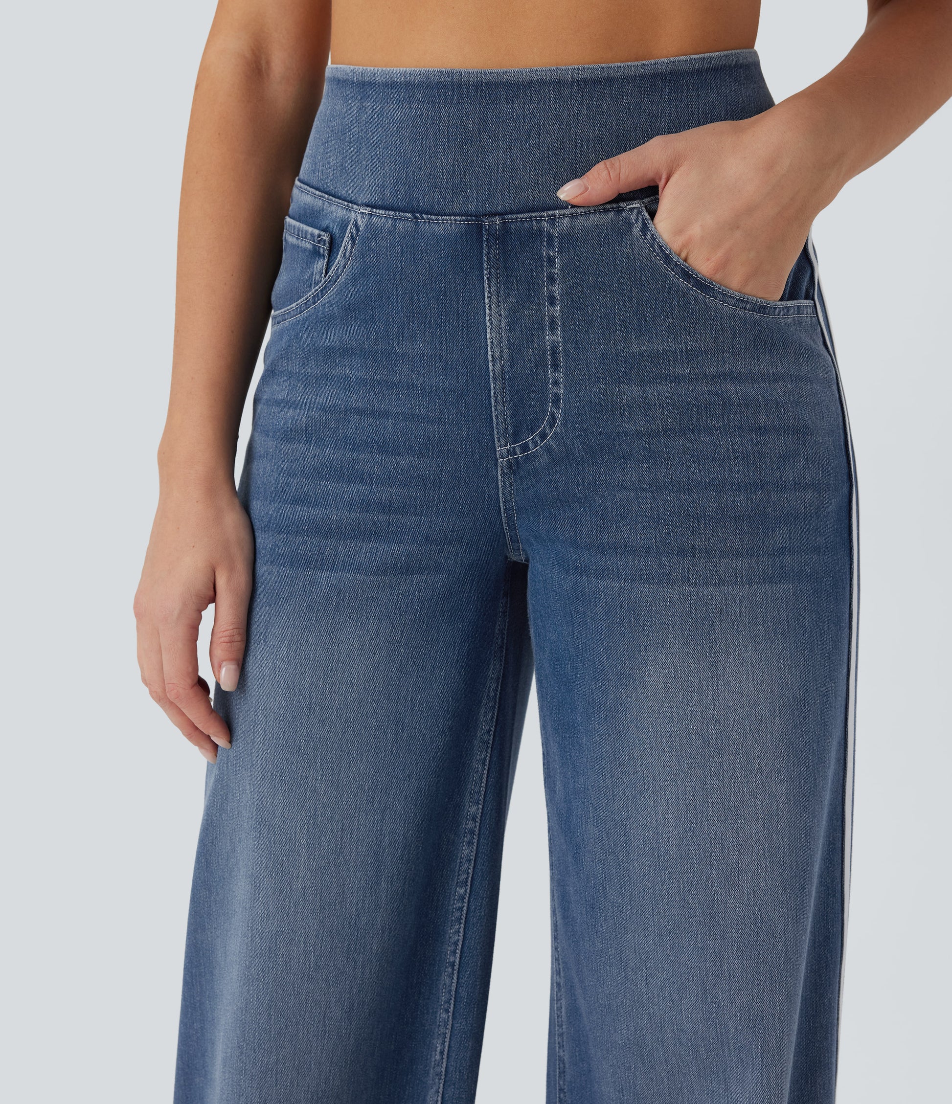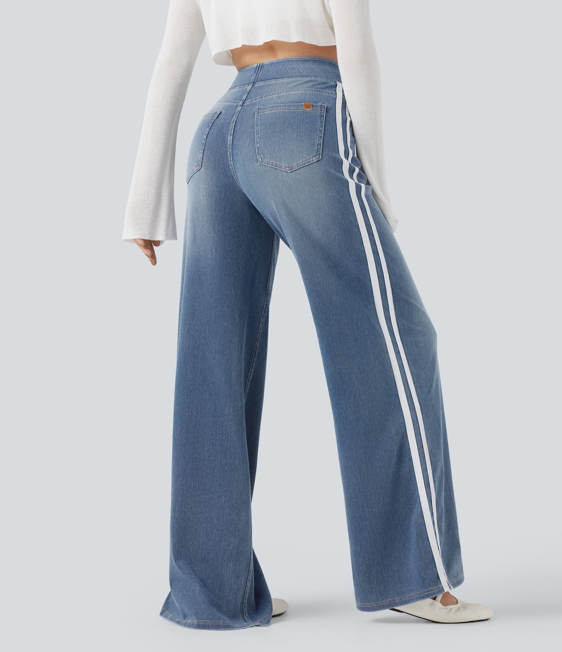 FYsuper-High Waisted Stripe Wide Leg Flowy Washed Casual Jeans with Pockets